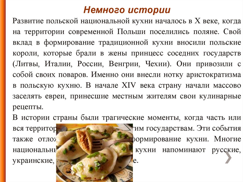 Немного историиРазвитие польской национальной кухни началось в Х веке, когда