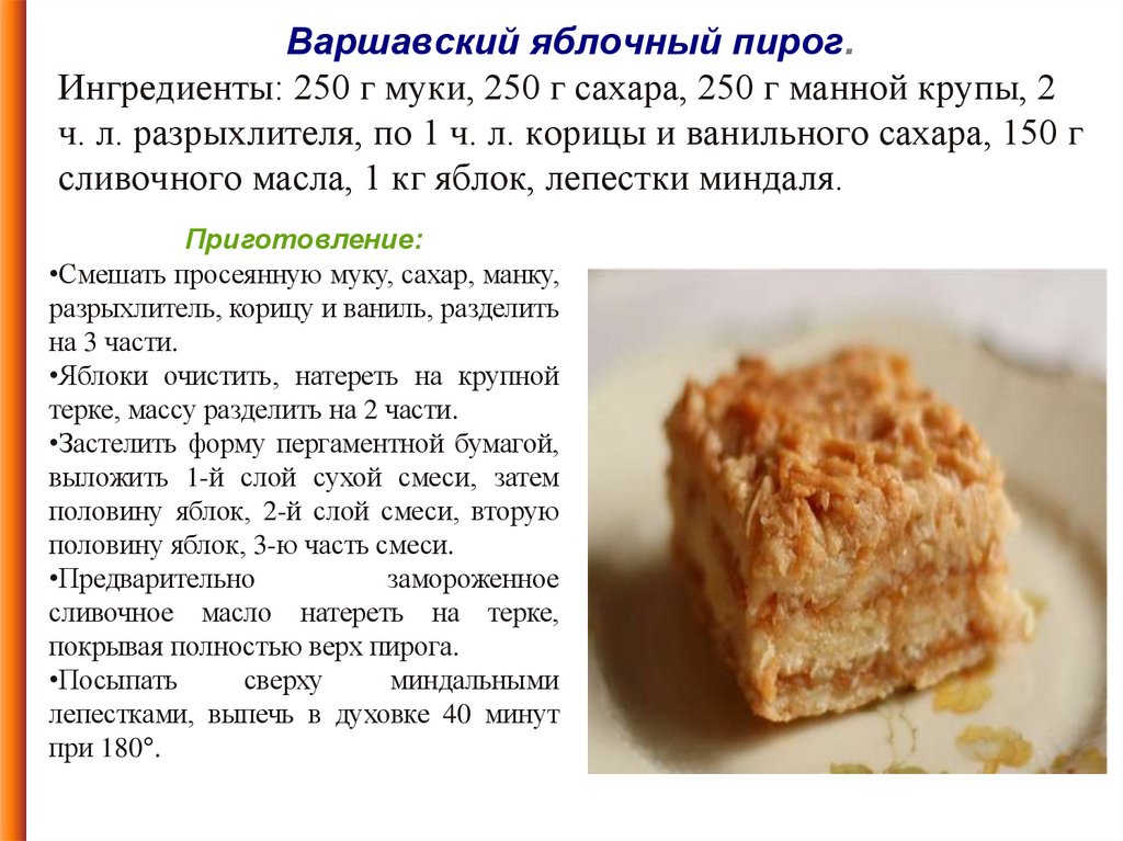 Варшавский яблочный пирог.Ингредиенты: 250 г муки, 250 г сахара, 250 г манной крупы, 2
