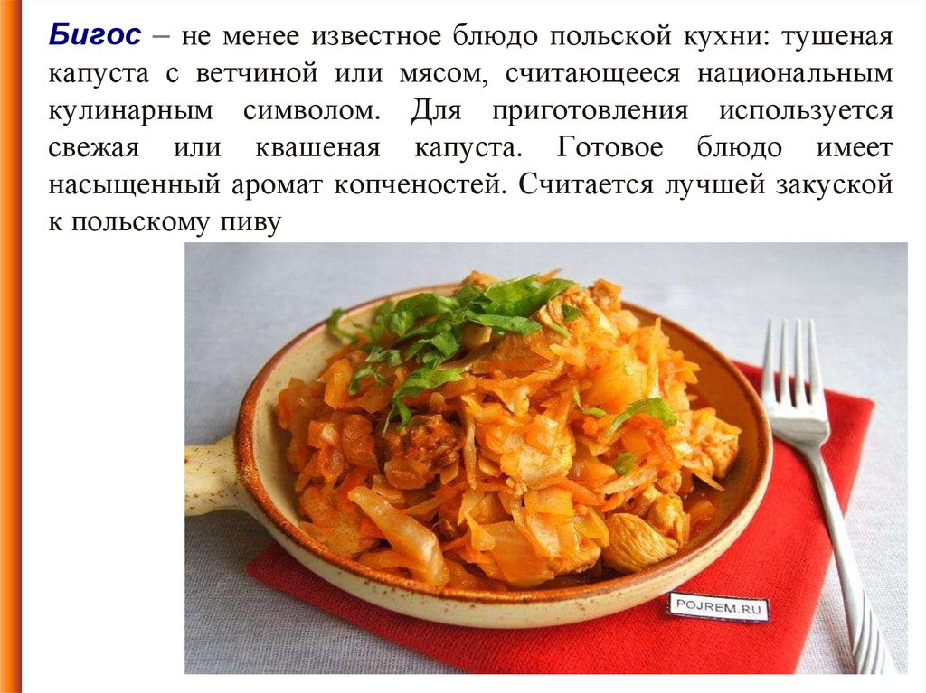 Бигос – не менее известное блюдо польской кухни: тушенаякапуста с ветчиной или мясом, считающееся национальным
