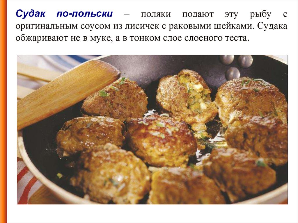 Судак по-польски – поляки подают эту рыбу соригинальным соусом из лисичек с раковыми шейками. Судака