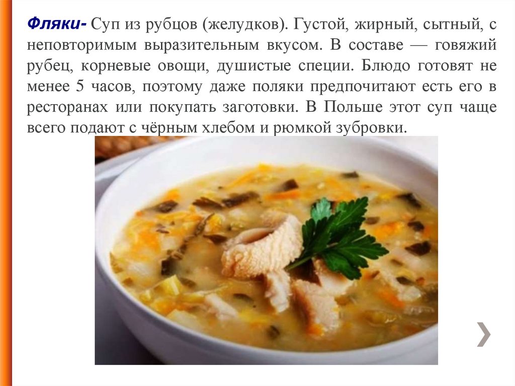 Фляки- Суп из рубцов (желудков). Густой, жирный, сытный, снеповторимым выразительным вкусом. В составе — говяжий