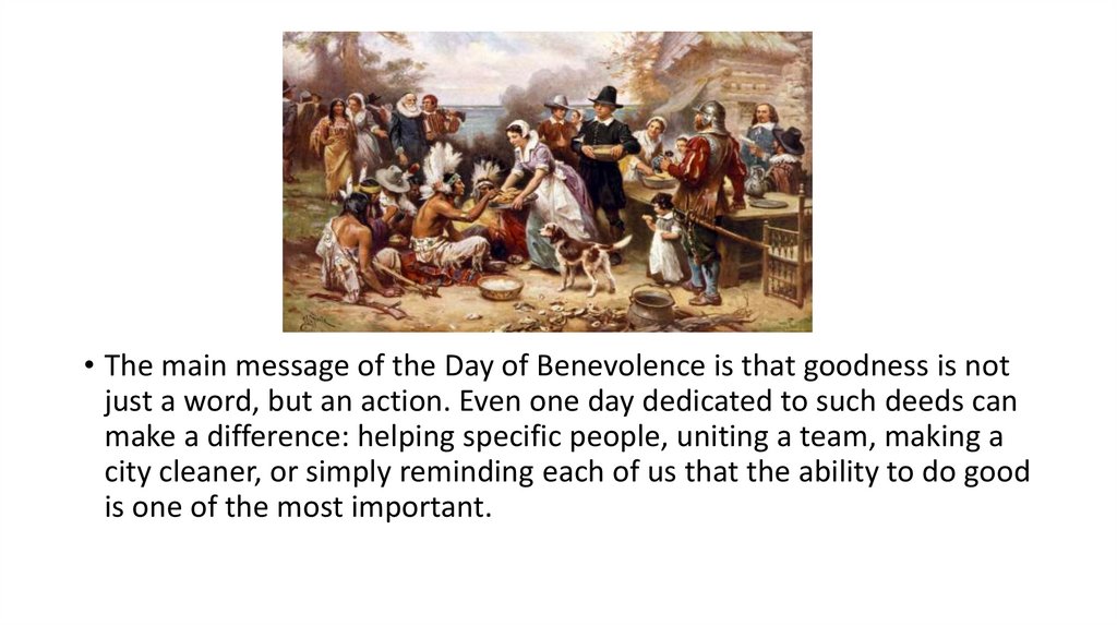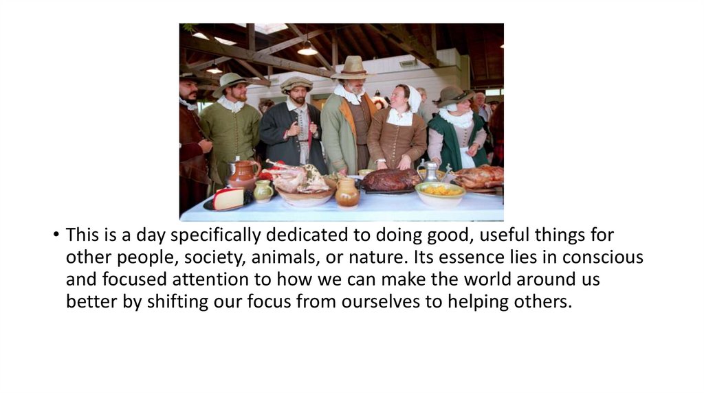 • This is a day specifically dedicated to doing good, useful things forother people, society, animals, or nature. Its essence lies in conscious