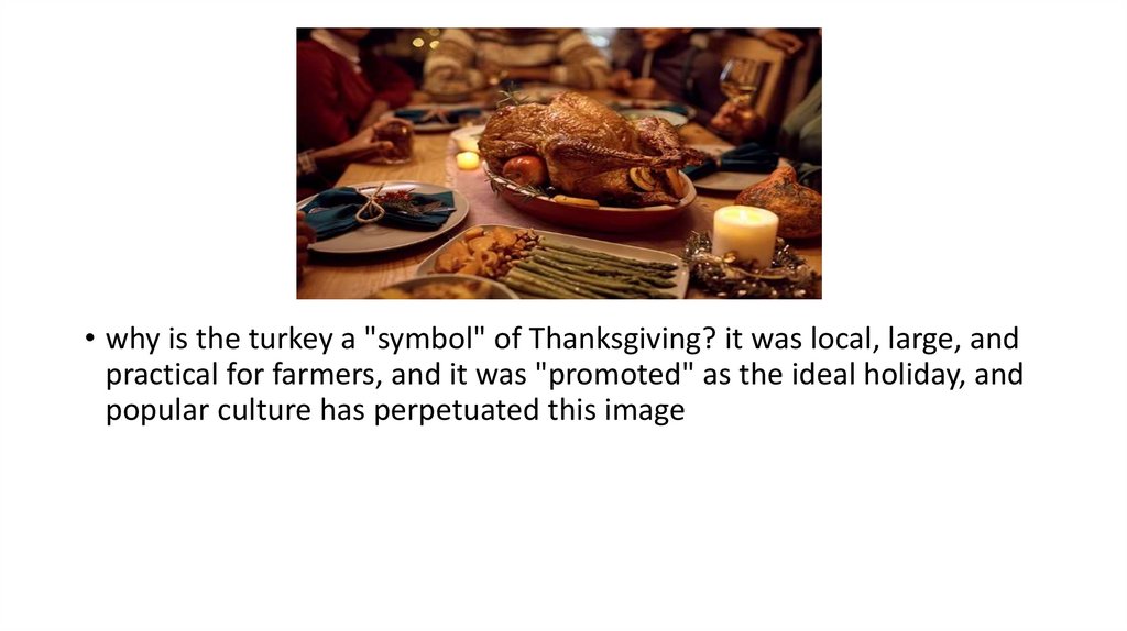 • why is the turkey a "symbol" of Thanksgiving? it was local, large, andpractical for farmers, and it was "promoted" as the ideal holiday, and