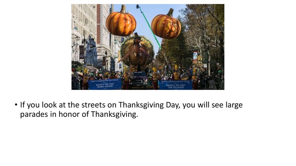 • If you look at the streets on Thanksgiving Day, you will see largeparades in honor of Thanksgiving.