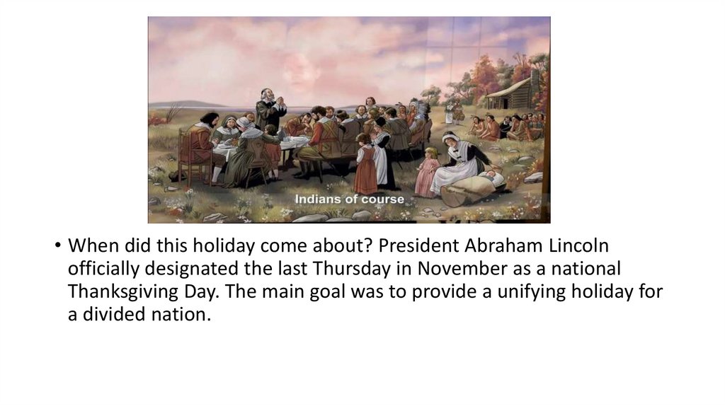 • When did this holiday come about? President Abraham Lincolnofficially designated the last Thursday in November as a national