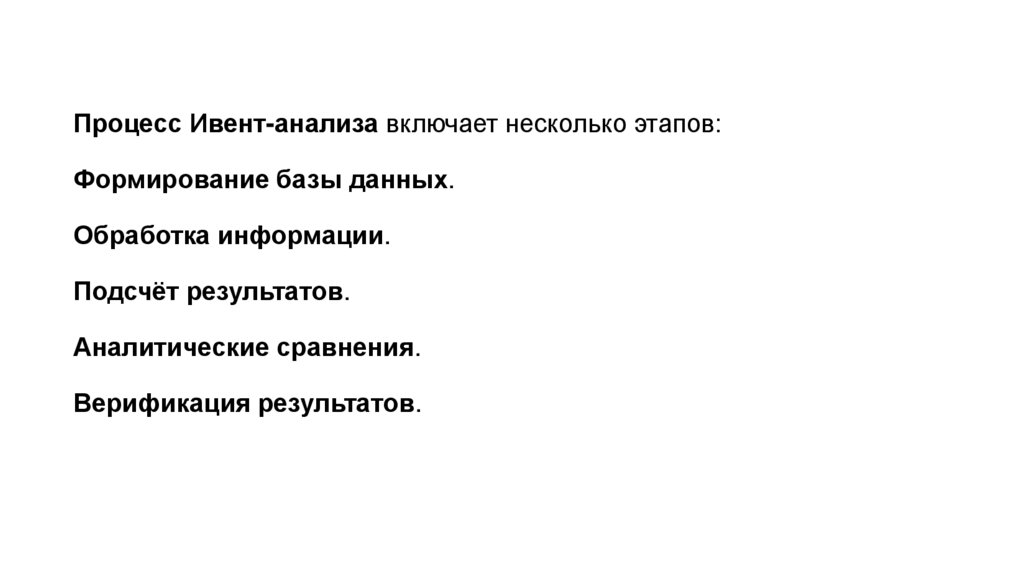 Процесс Ивент-анализа включает несколько этапов:Формирование базы данных.