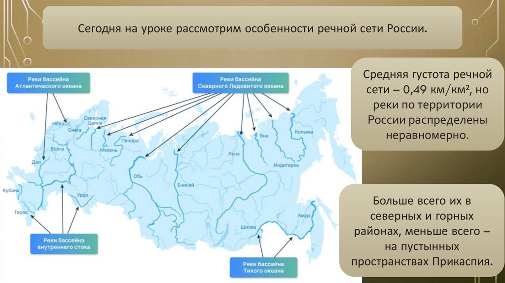 Сегодня на уроке рассмотрим особенности речной сети России.Средняя густота речной