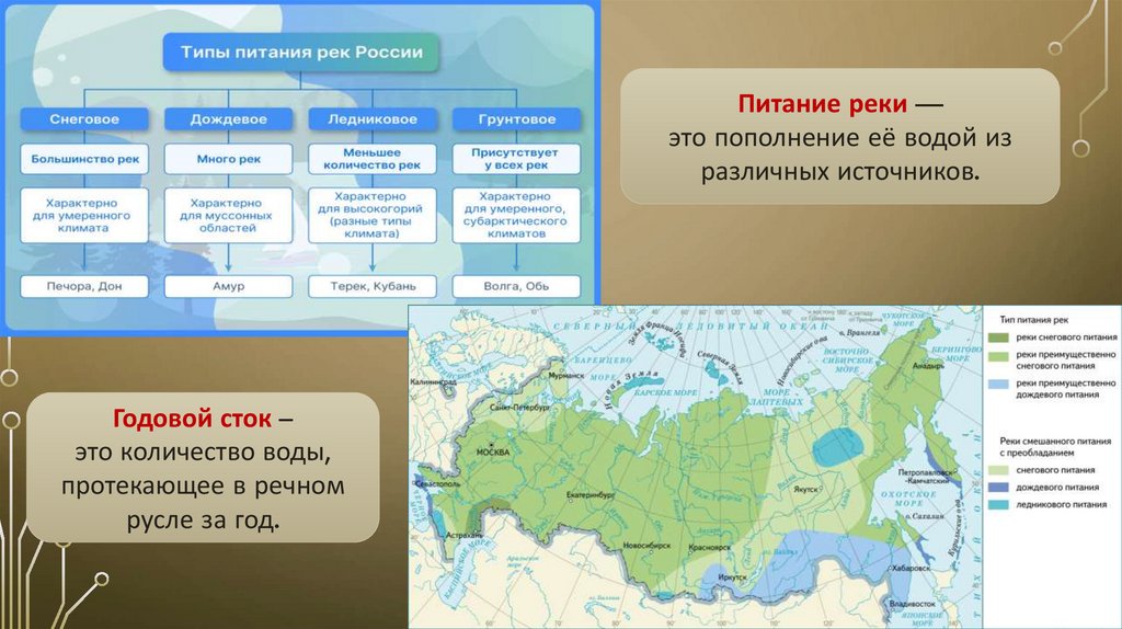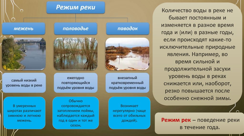 Климатические условия и основные типы питания влияют на режим рек– сезонное изменение стока.
