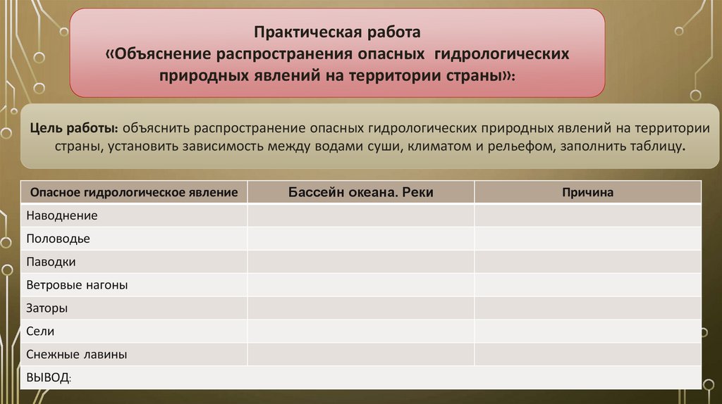 Цель работы: объяснить распространение опасных гидрологических природных явлений на территории