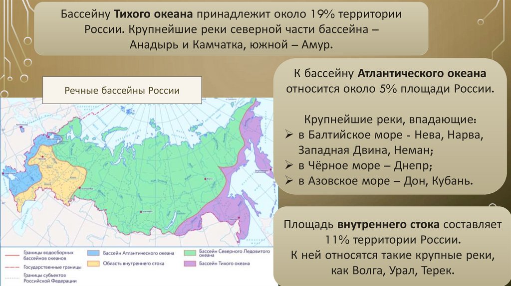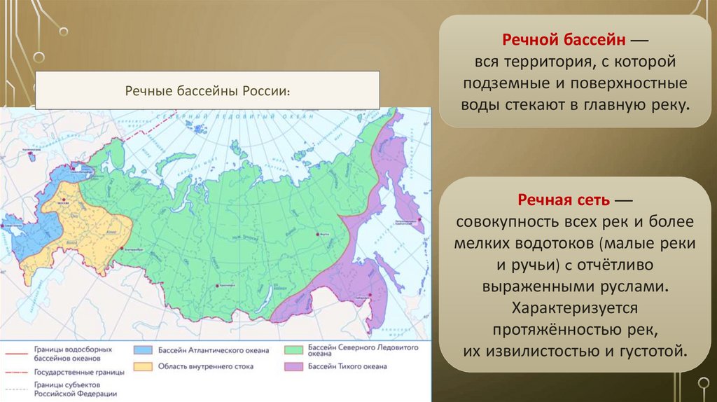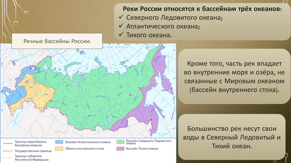 Речные бассейны России:Реки России относятся к бассейнам трёх океанов: