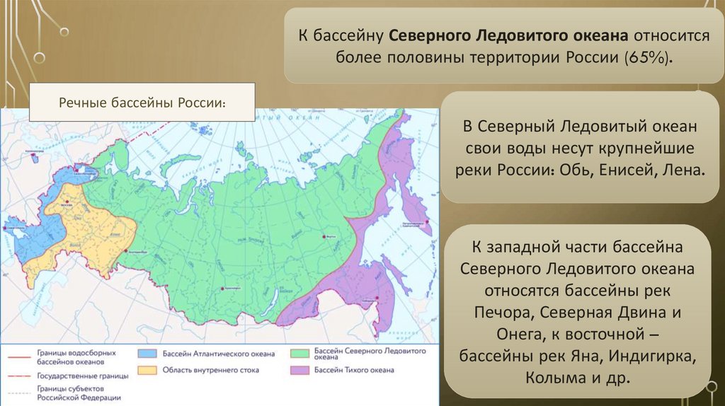 К бассейну Северного Ледовитого океана относитсяболее половины территории России (65%).