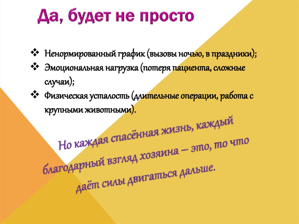 Ненормированный график (вызовы ночью, в праздники);Эмоциональная нагрузка (потеря пациента, сложные