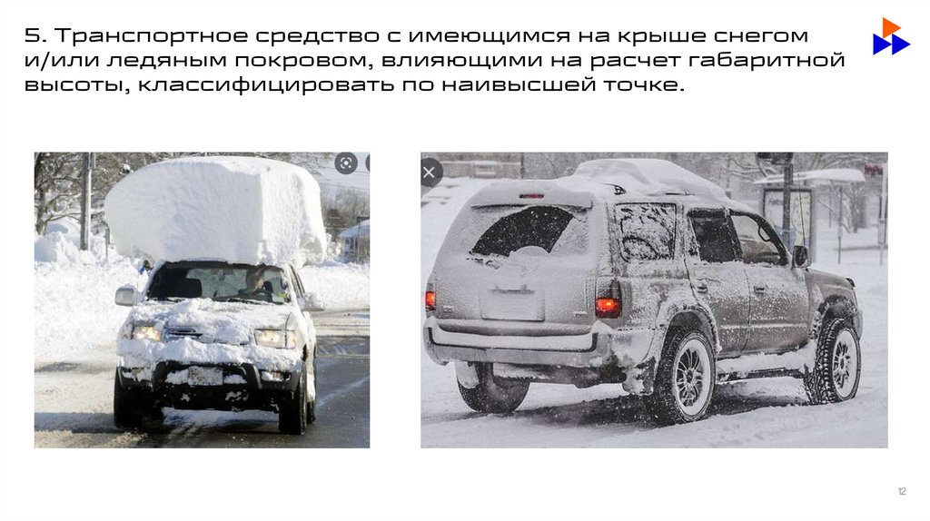 5. Транспортное средство с имеющимся на крыше снегоми/или ледяным покровом, влияющими на расчет габаритной