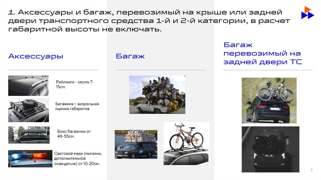 1. Аксессуары и багаж, перевозимый на крыше или заднейдвери транспортного средства 1-й и 2-й категории, в расчет