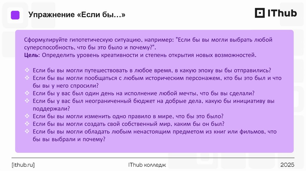 Упражнение «Если бы…»Сформулируйте гипотетическую ситуацию, например: "Если бы вы могли выбрать любой