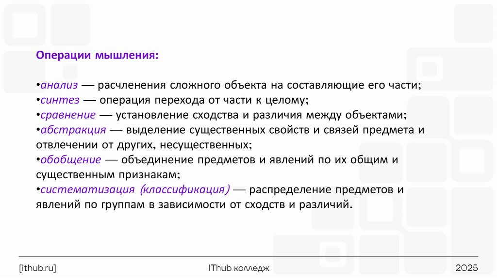 Операции мышления:•анализ — расчленения сложного объекта на составляющие его части;