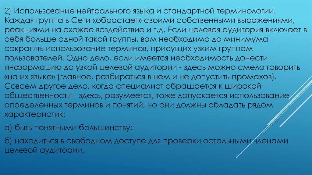 2) Использование нейтрального языка и стандартной терминологии.Каждая группа в Сети «обрастает» своими собственными выражениями,