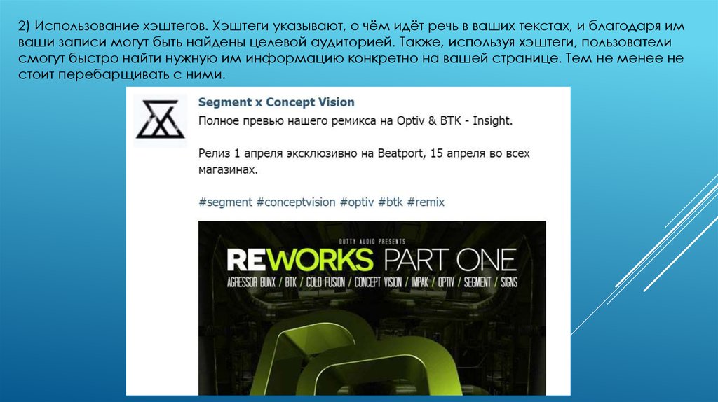 2) Использование хэштегов. Хэштеги указывают, о чём идёт речь в ваших текстах, и благодаря имваши записи могут быть найдены целевой аудиторией. Также, используя хэштеги, пользователи