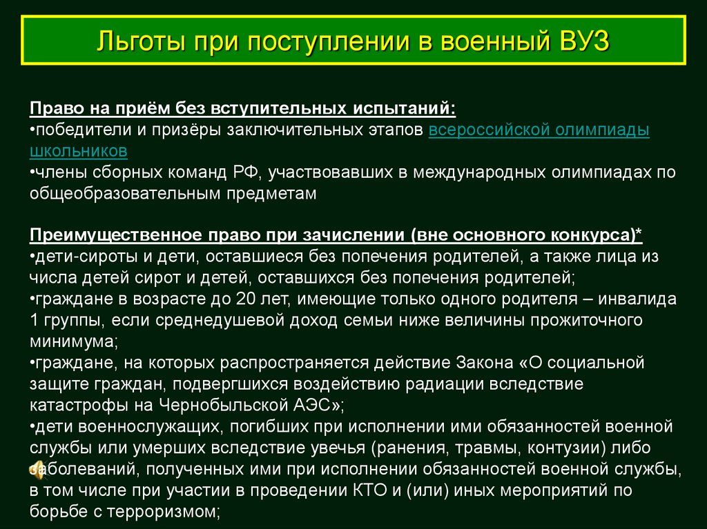 Льготы при поступлении в военный ВУЗПраво на приём без вступительных испытаний:
