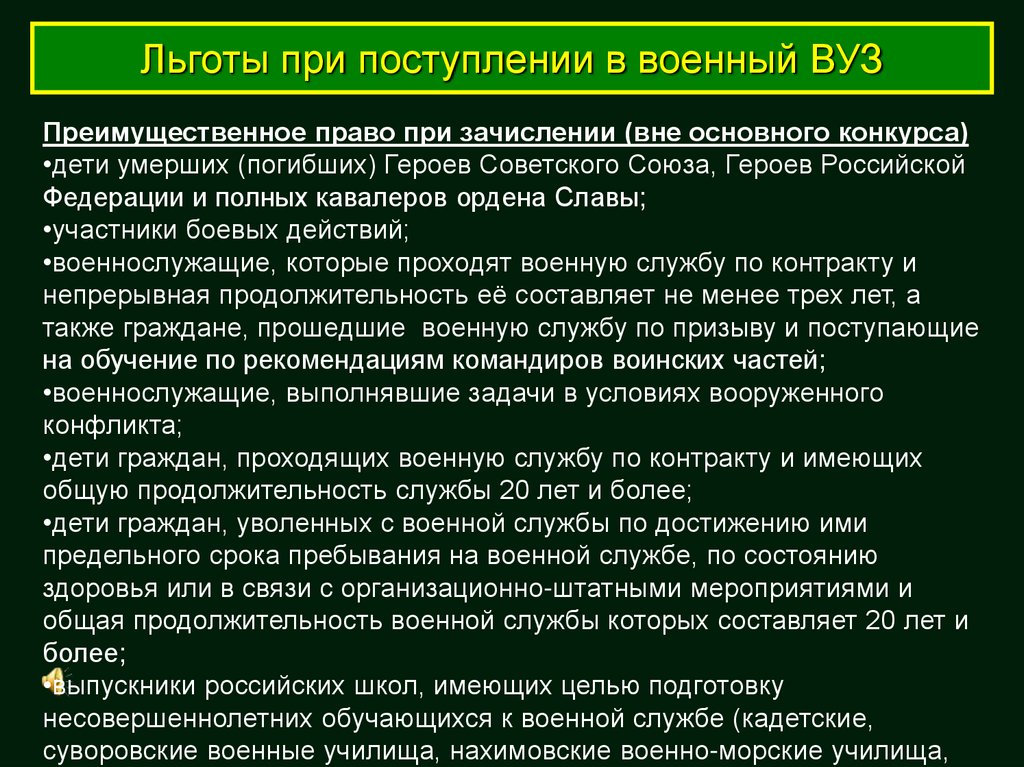 Льготы при поступлении в военный ВУЗПреимущественное право при зачислении (вне основного конкурса)
