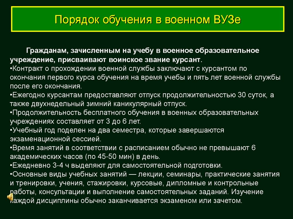 Порядок обучения в военном ВУЗеГражданам, зачисленным на учебу в военное образовательное