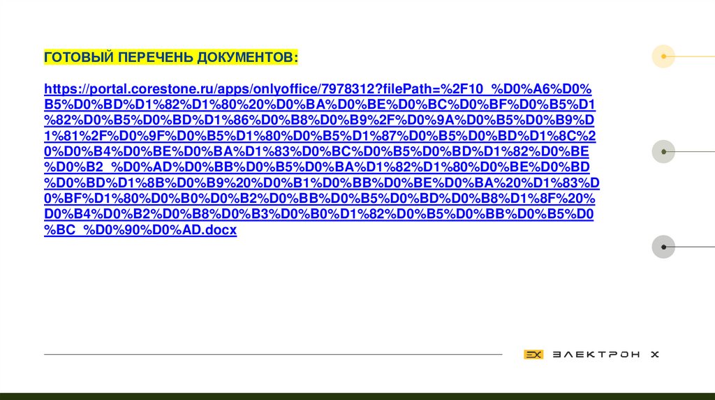 ГОТОВЫЙ ПЕРЕЧЕНЬ ДОКУМЕНТОВ:https://portal.corestone.ru/apps/onlyoffice/7978312?filePath=%2F10_%D0%A6%D0%