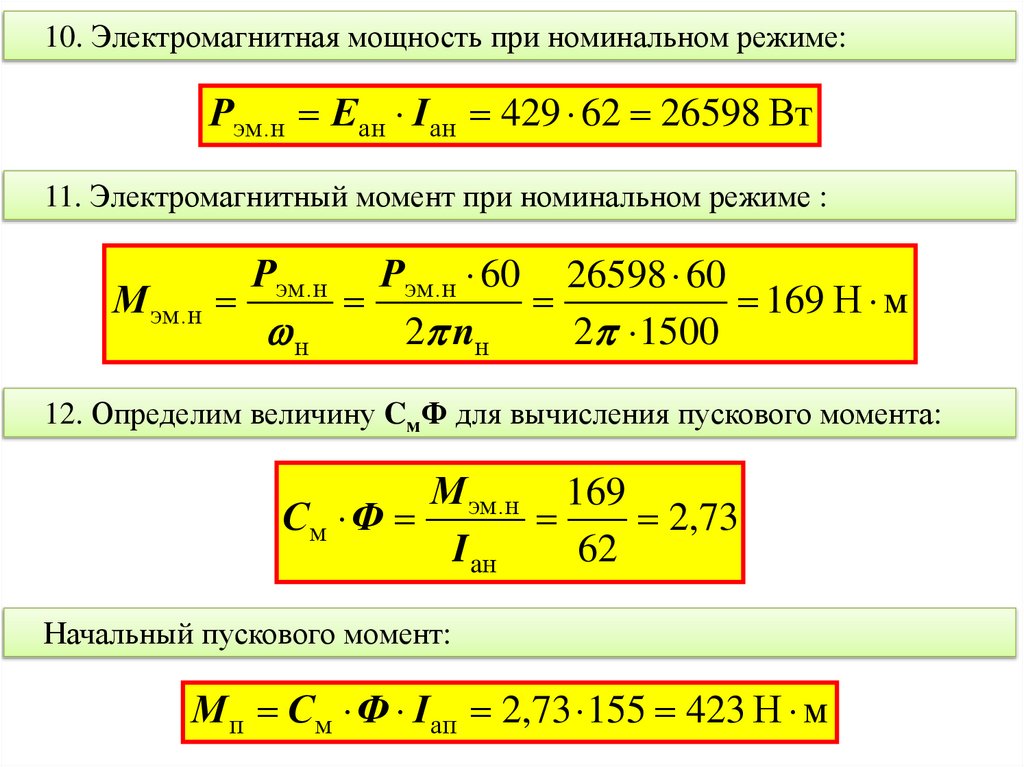 10. Электромагнитная мощность при номинальном режиме:Рэм.н Еaн I aн 429 62 26598 Вт