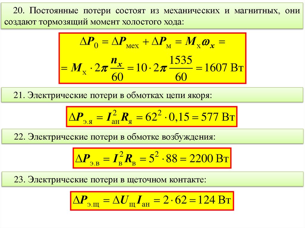 20. Постоянные потери состоят из механических и магнитных, онисоздают тормозящий момент холостого хода: