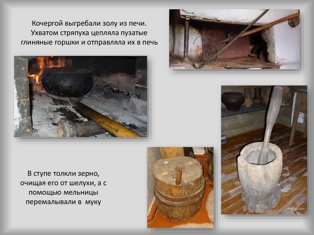 Кочергой выгребали золу из печи.Ухватом стряпуха цепляла пузатые