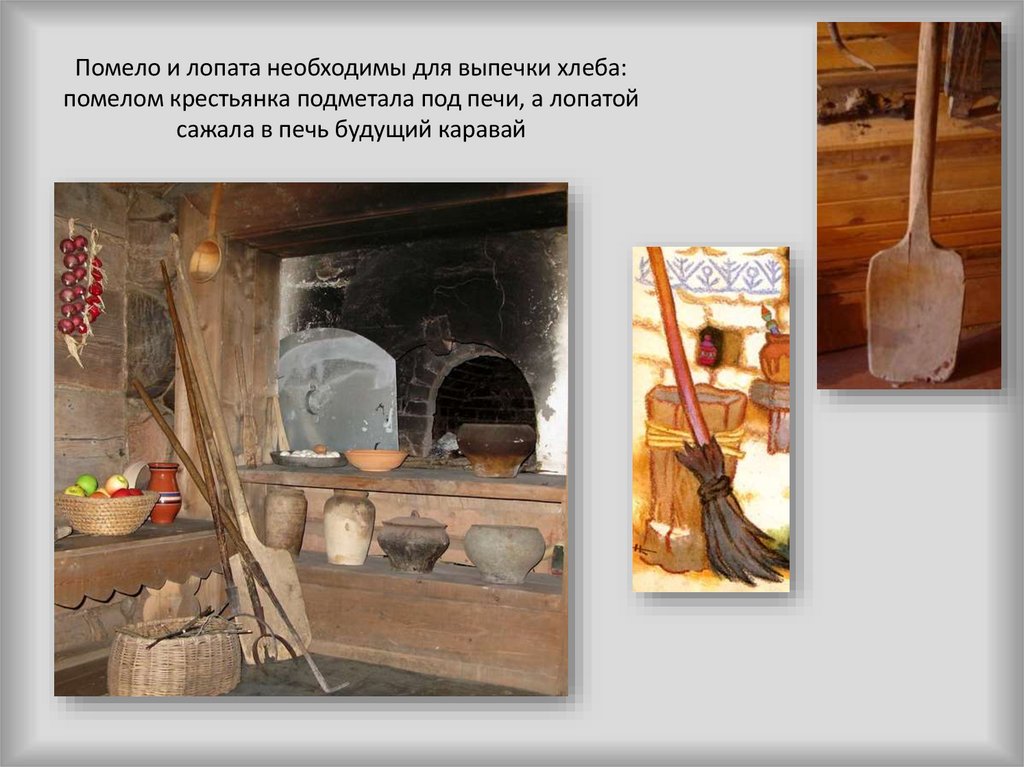 Помело и лопата необходимы для выпечки хлеба:помелом крестьянка подметала под печи, а лопатой