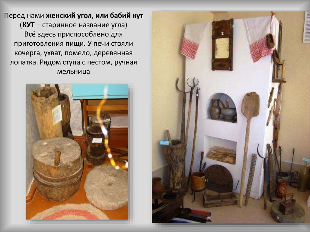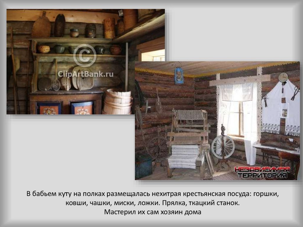 В бабьем куту на полках размещалась нехитрая крестьянская посуда: горшки,ковши, чашки, миски, ложки. Прялка, ткацкий станок.