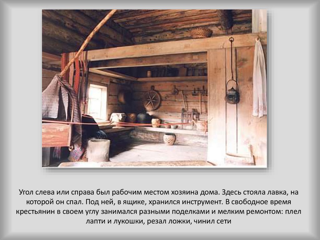Угол слева или справа был рабочим местом хозяина дома. Здесь стояла лавка, накоторой он спал. Под ней, в ящике, хранился инструмент. В свободное время