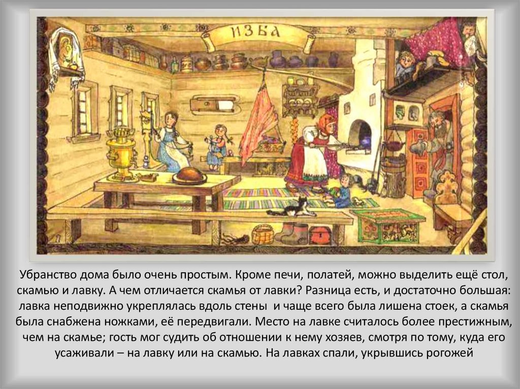 Убранство дома было очень простым. Кроме печи, полатей, можно выделить ещё стол,скамью и лавку. А чем отличается скамья от лавки? Разница есть, и достаточно большая: