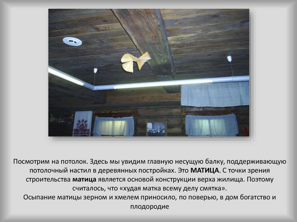 Посмотрим на потолок. Здесь мы увидим главную несущую балку, поддерживающуюпотолочный настил в деревянных постройках. Это МАТИЦА. С точки зрения