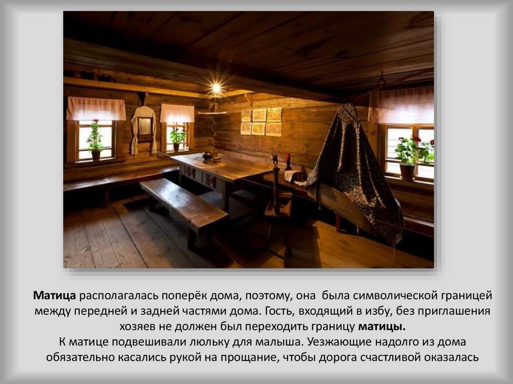 Матица располагалась поперёк дома, поэтому, она была символической границеймежду передней и задней частями дома. Гость, входящий в избу, без приглашения