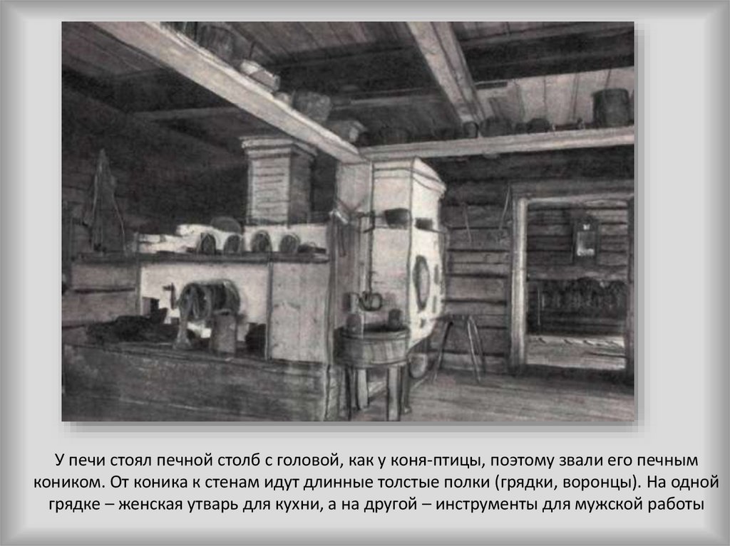 У печи стоял печной столб с головой, как у коня-птицы, поэтому звали его печнымкоником. От коника к стенам идут длинные толстые полки (грядки, воронцы). На одной