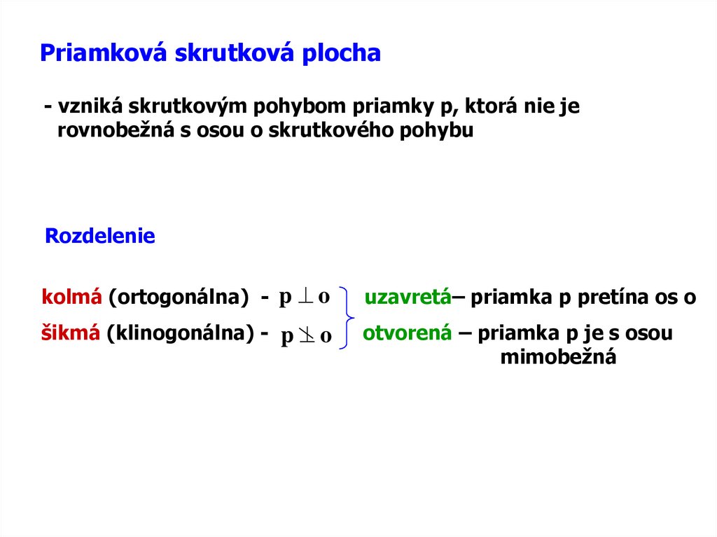 Priamková skrutková plocha- vzniká skrutkovým pohybom priamky p, ktorá nie je