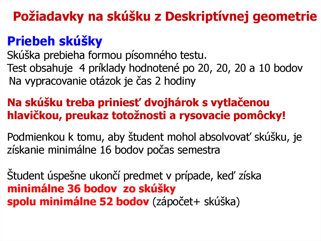 Požiadavky na skúšku z Deskriptívnej geometriePriebeh skúšky