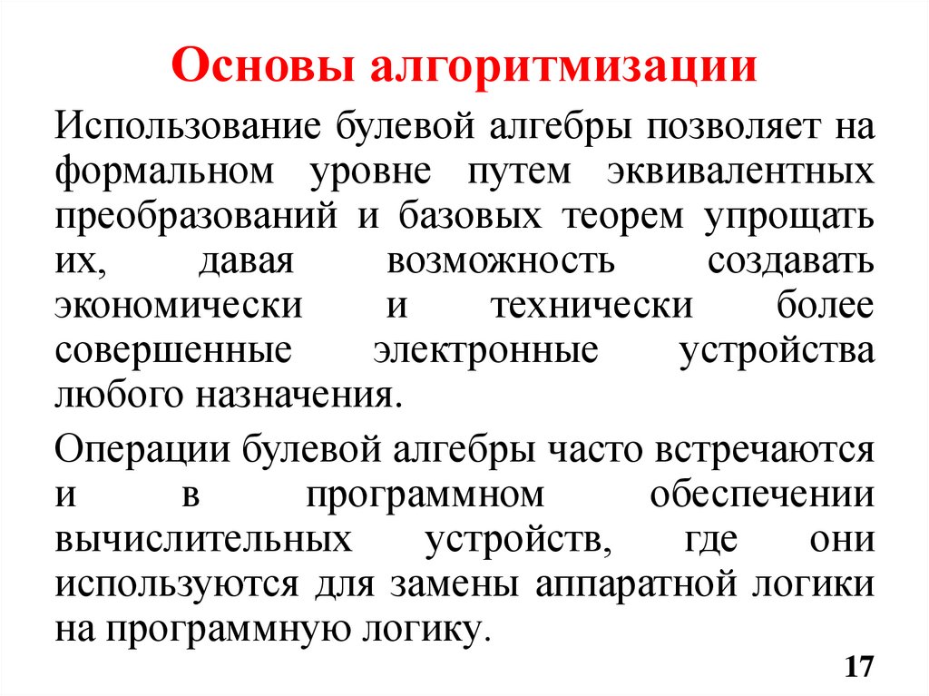 Основы алгоритмизацииИспользование булевой алгебры позволяет на