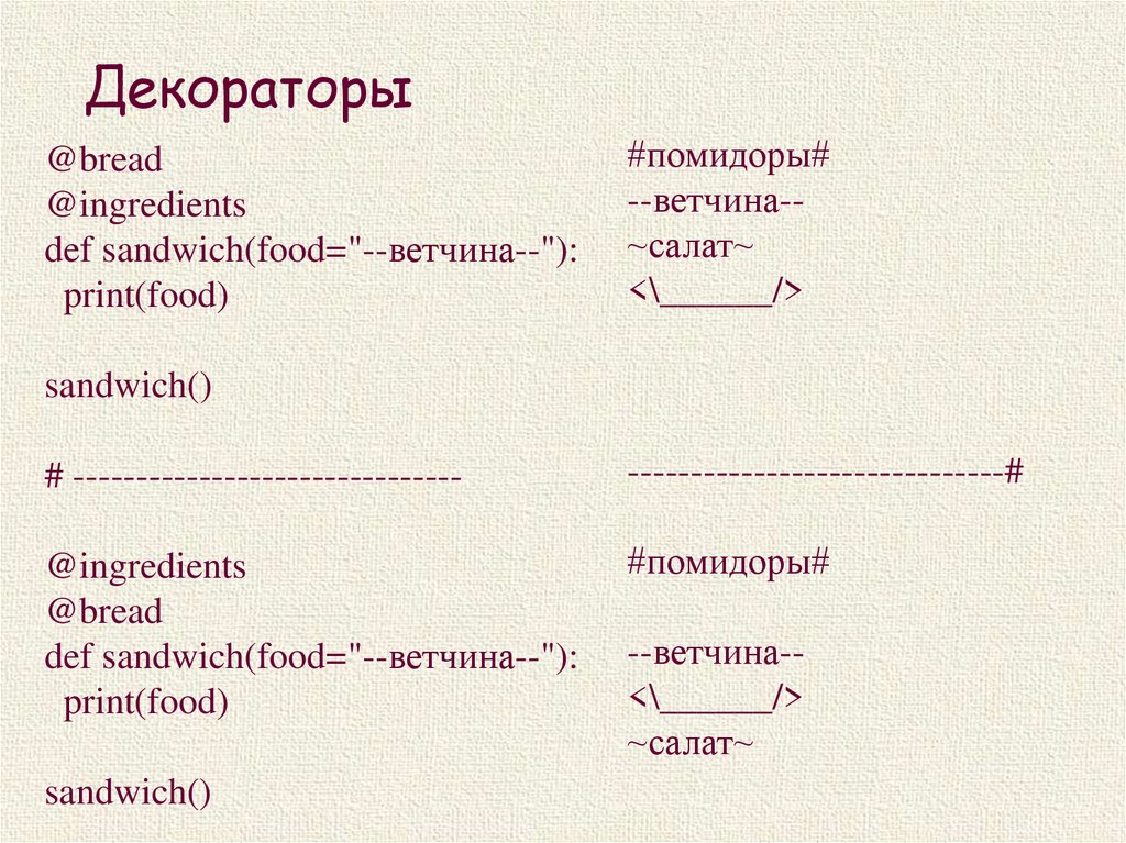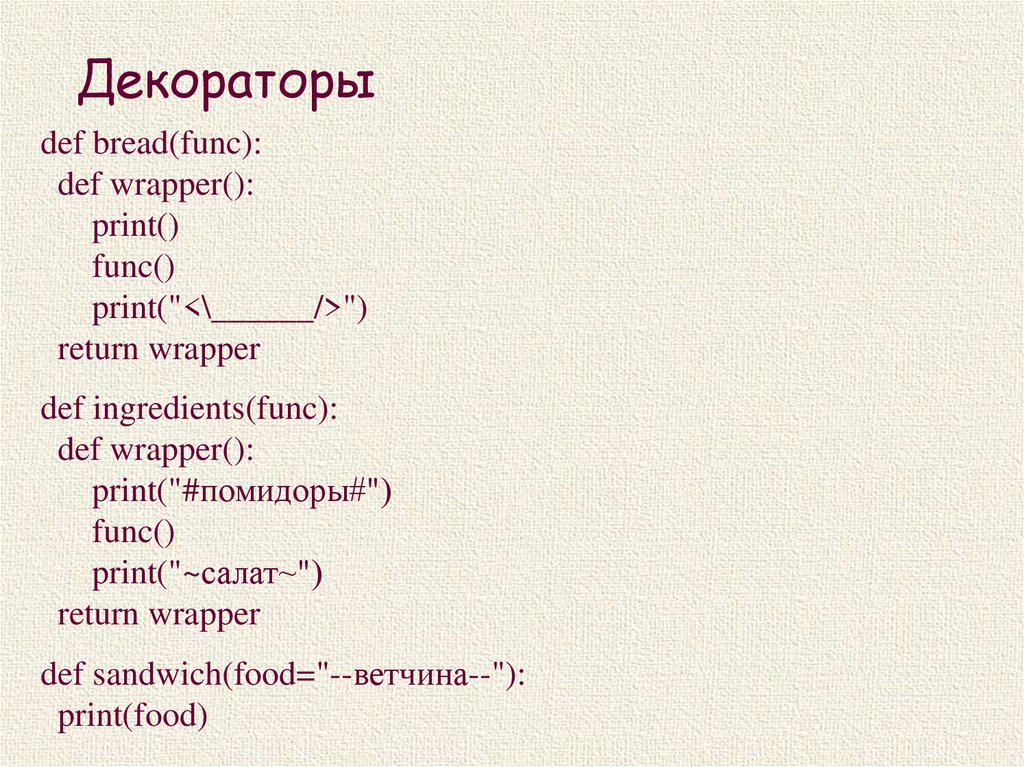 Декораторыdef bread(func):