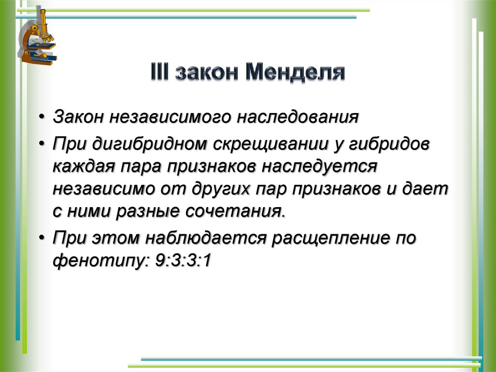 • Закон независимого наследования• При дигибридном скрещивании у гибридов