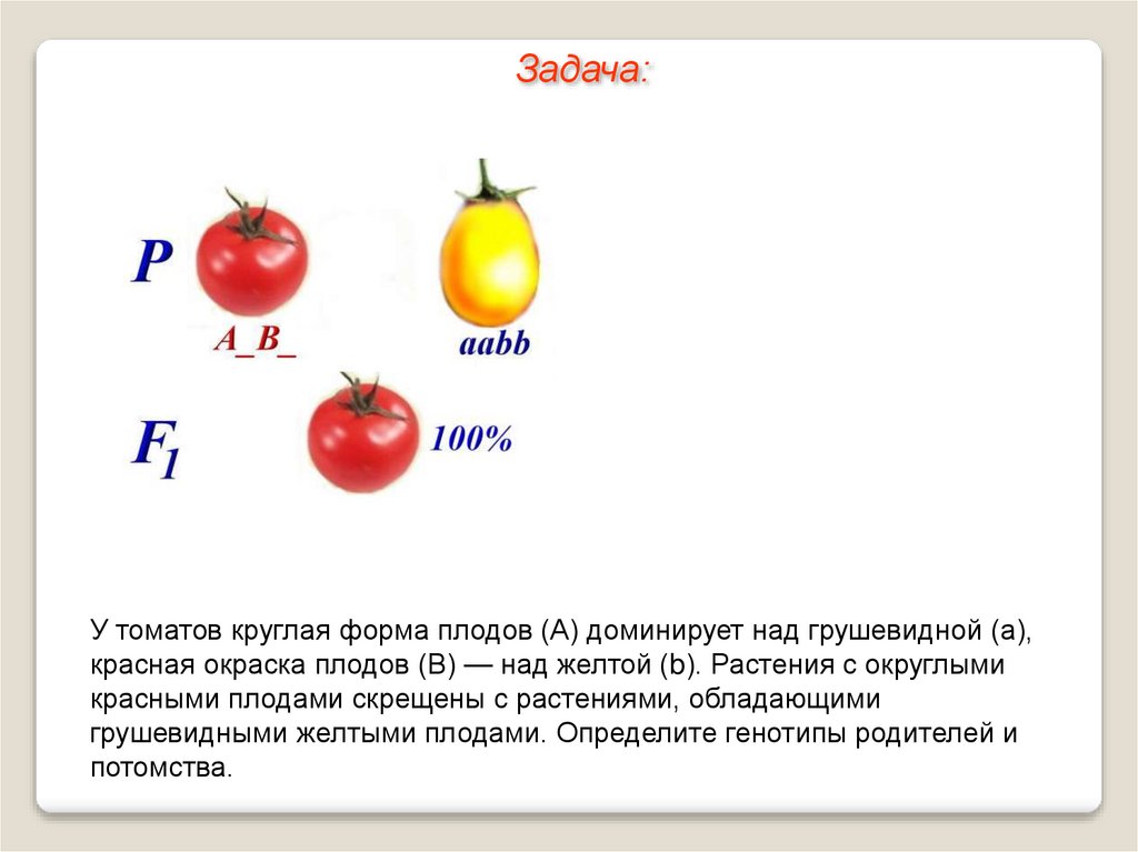 Задача:У томатов круглая форма плодов (А) доминирует над грушевидной (а),