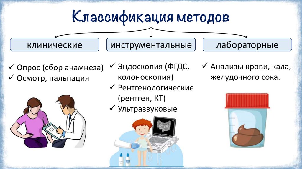 Опрос (сбор анамнеза) Эндоскопия (ФГДС, Анализы крови, кала,