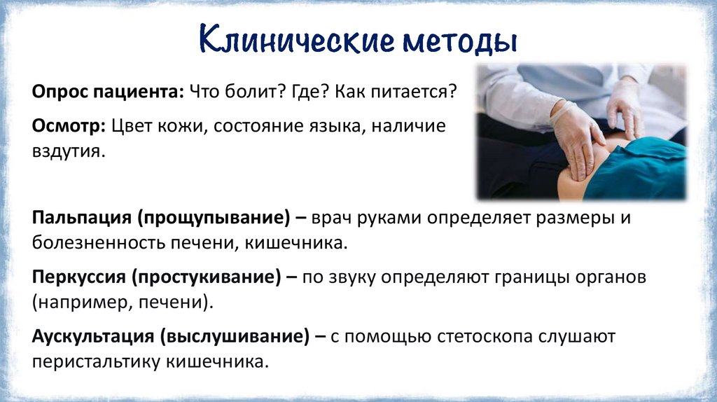 Опрос пациента: Что болит? Где? Как питается?Осмотр: Цвет кожи, состояние языка, наличие