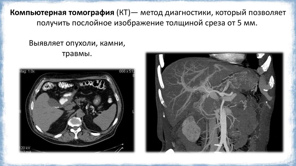 Компьютерная томография (КТ)— метод диагностики, который позволяетполучить послойное изображение толщиной среза от 5 мм.