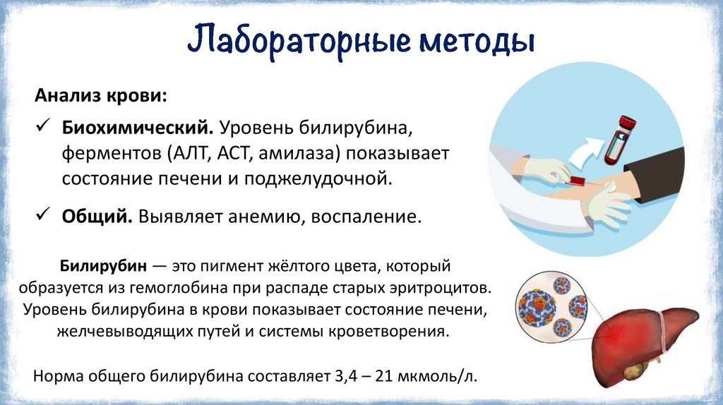 Анализ крови:Биохимический. Уровень билирубина,
