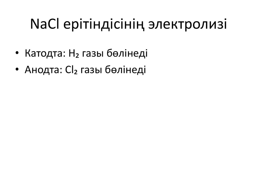 NaCl ерітіндісінің электролизі• Катодта: H₂ газы бөлінеді