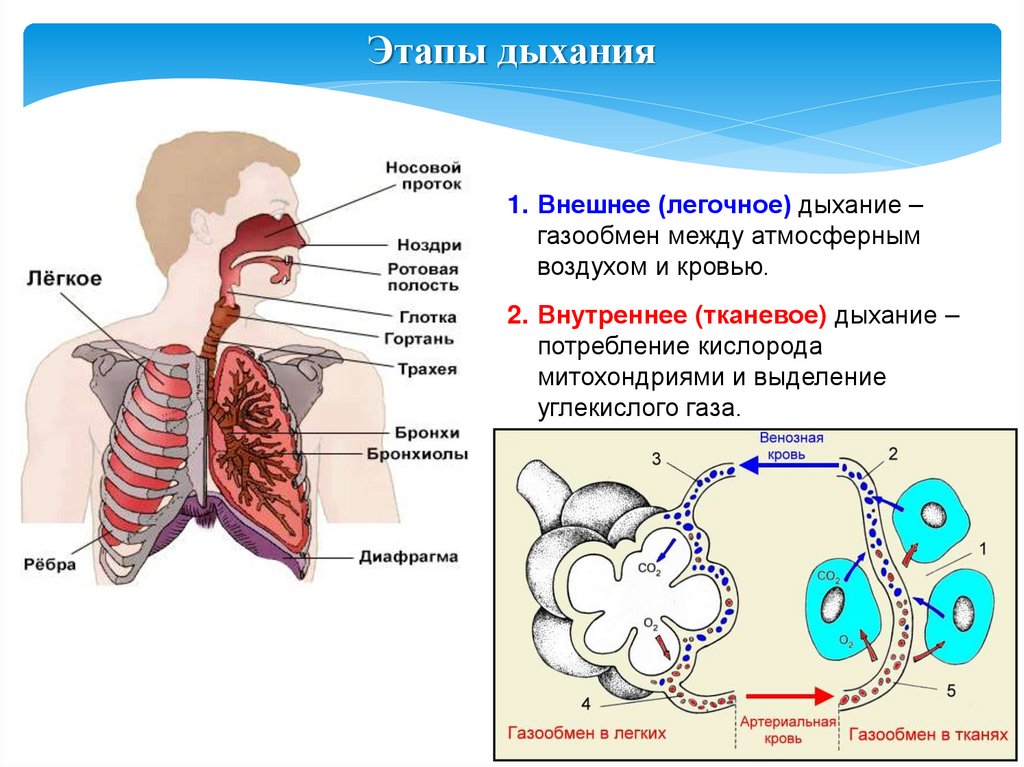 Этапы дыхания1. Внешнее (легочное) дыхание –