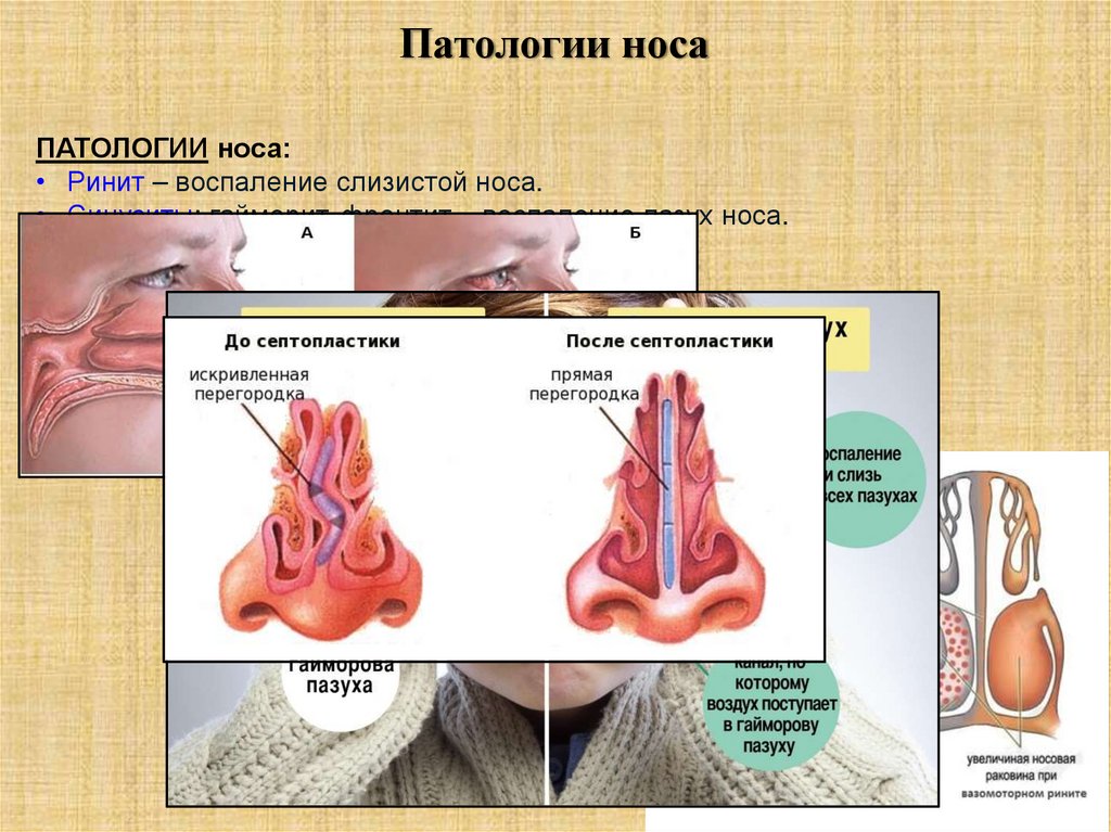 • Синуситы: гайморит, фронтит – воспаление пазух носа.