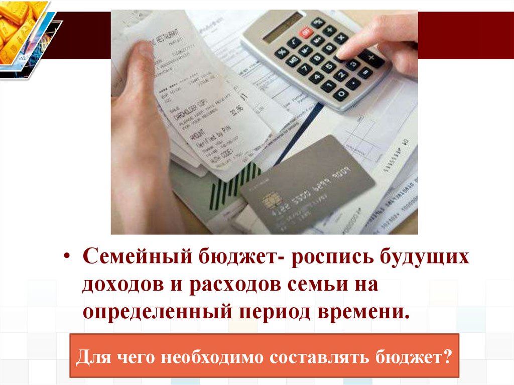 • Семейный бюджет- роспись будущихдоходов и расходов семьи на